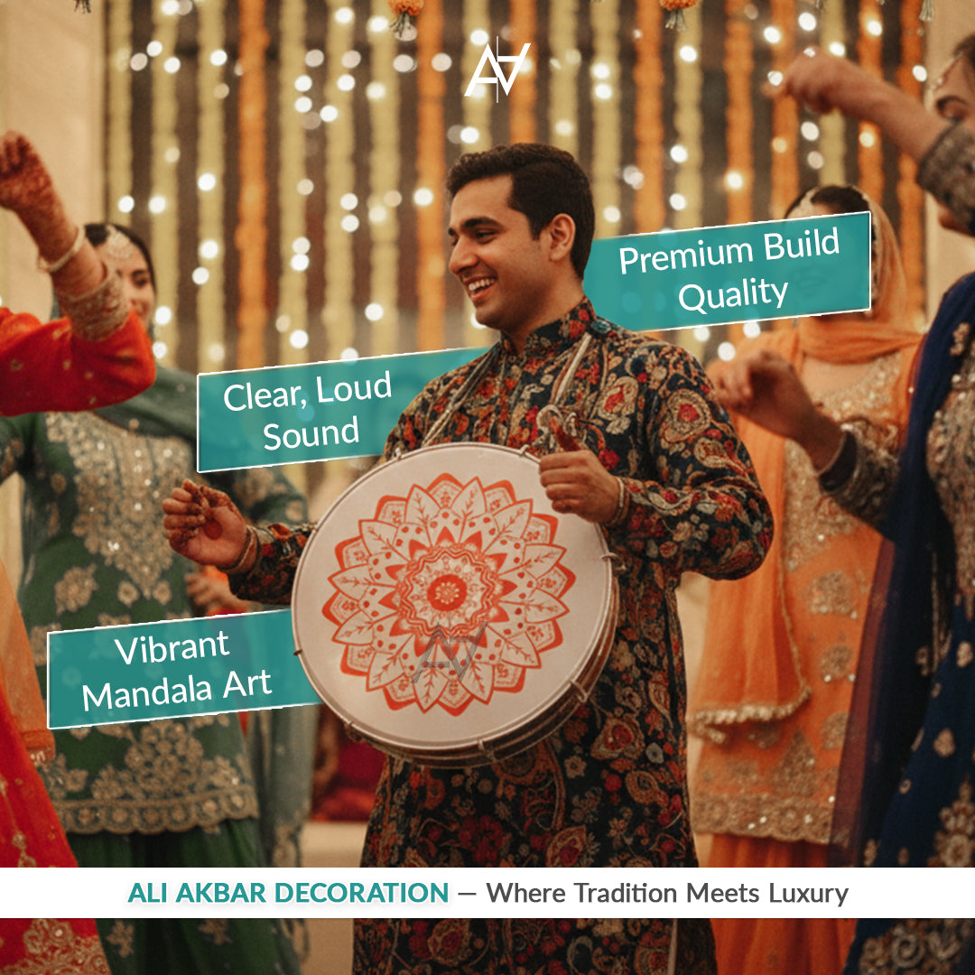 Bring energy and festivity to your Mehndi and wedding functions with this 3 Pcs Duffli Set. Available in sizes 14×14, 16×16, and 18×18, these dholkis are perfect for dance, singing, and traditional gatherings. A must-have for Mehndi, Mayoun, and cultural events across Pakistan.